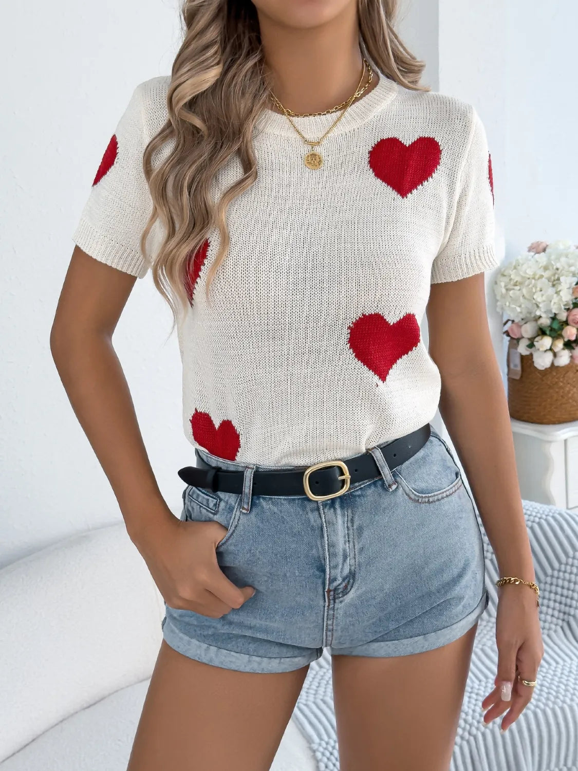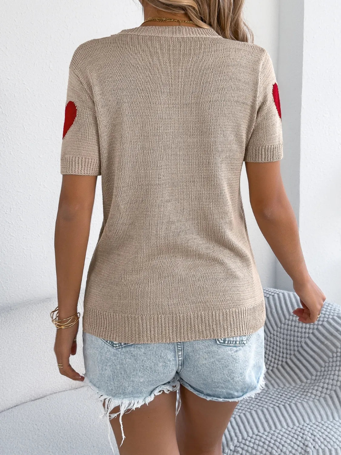 Heart Round Neck Short Sleeve Knit Top