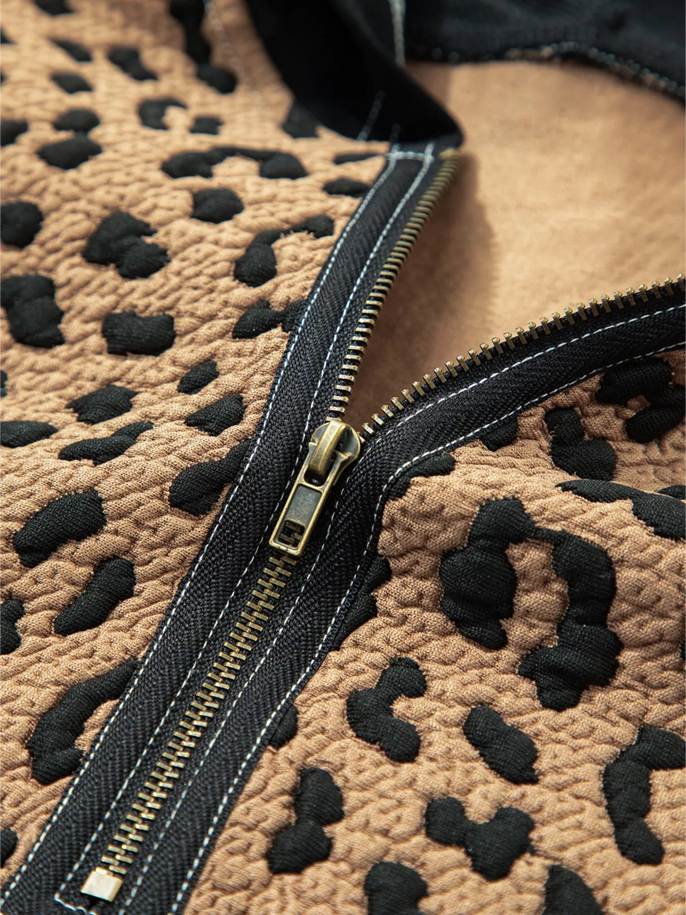 Leopard Patchwork Contrast Stitching Knotted Cuff Quarter Zip Hoodie