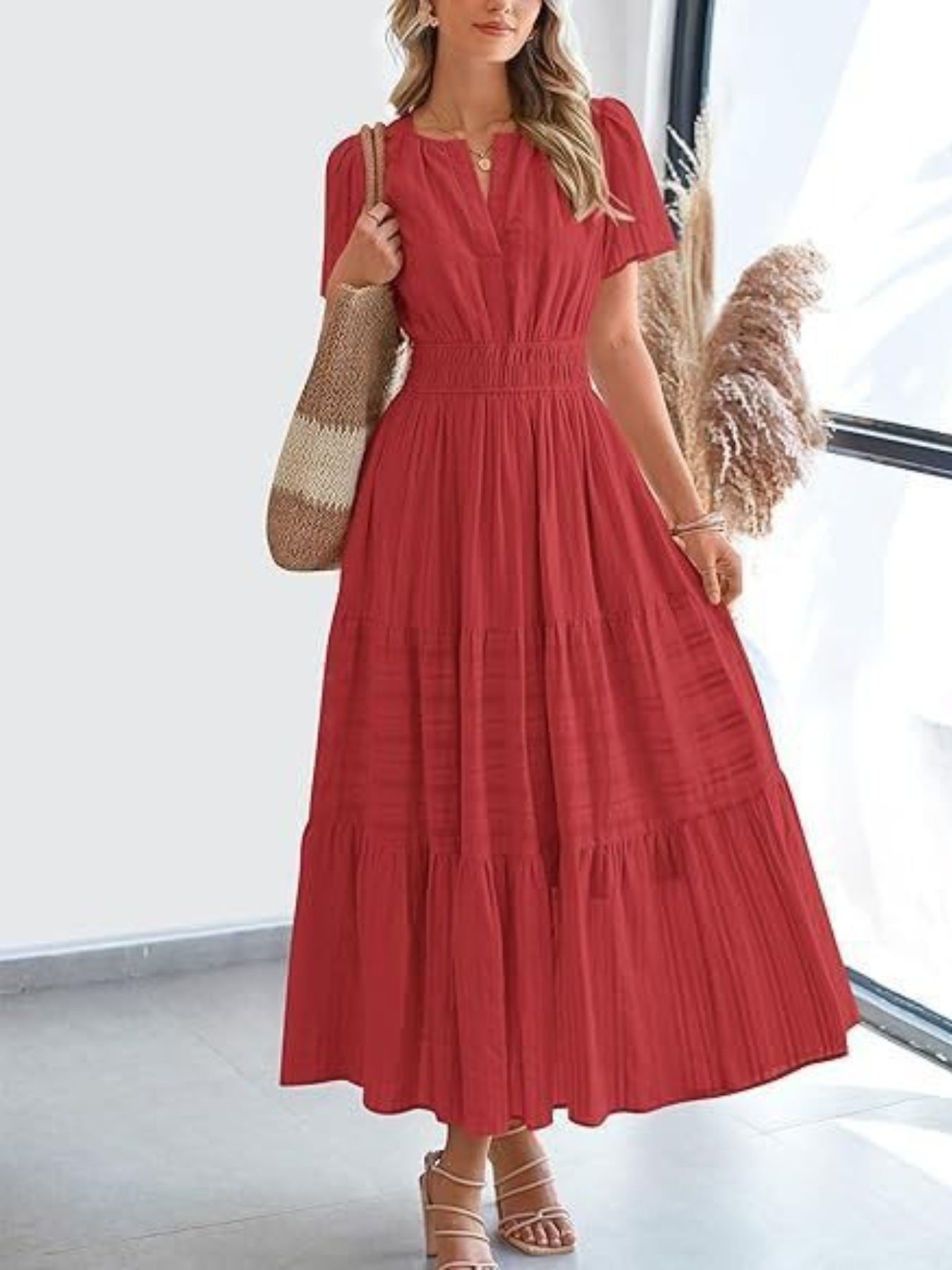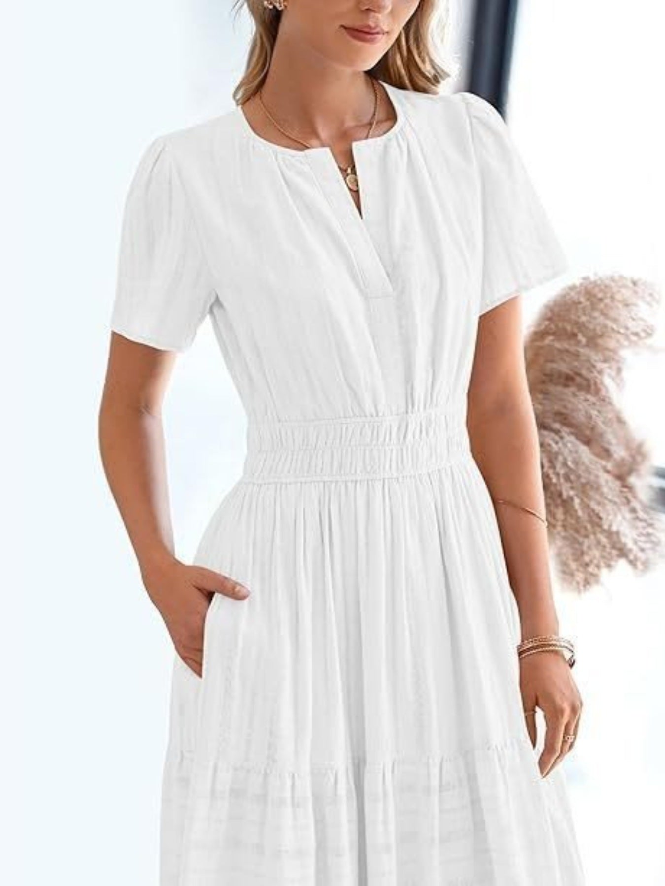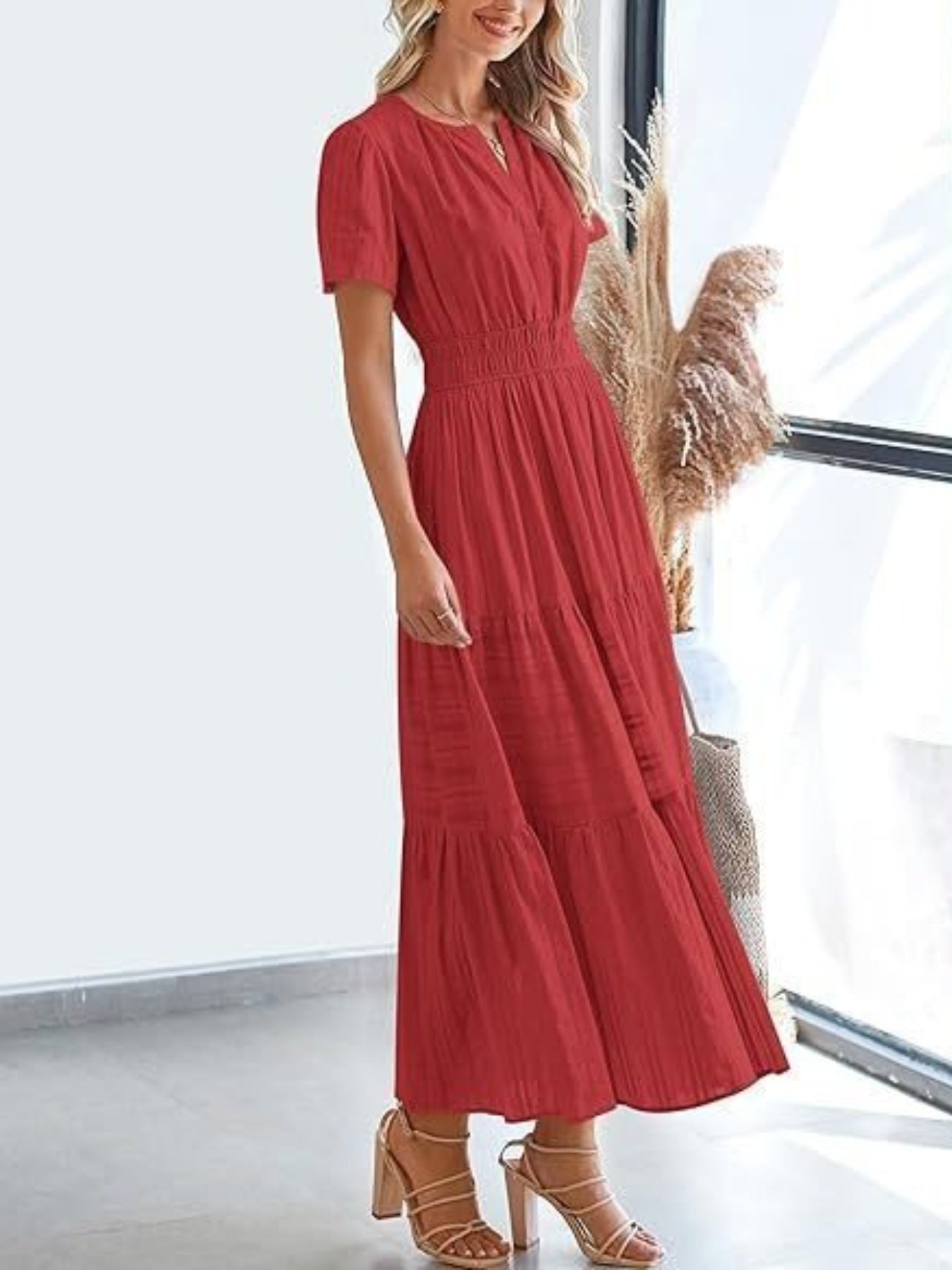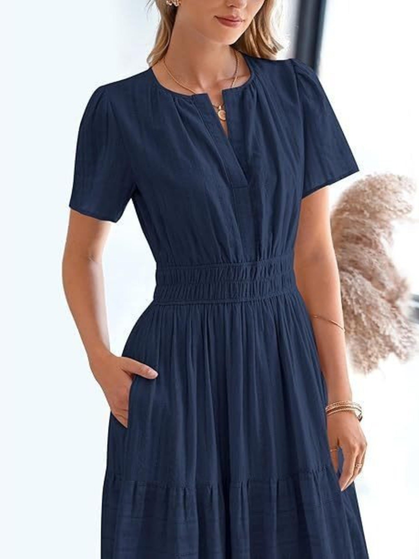 Notched Short Sleeve Tiered Dress