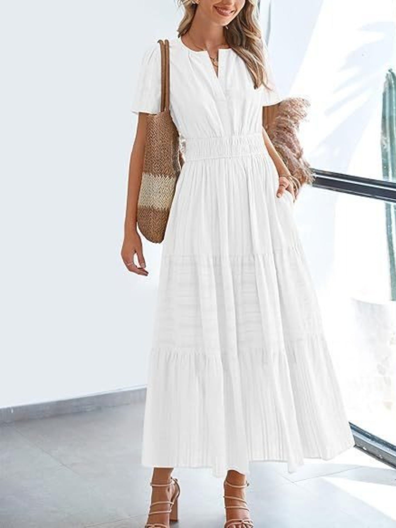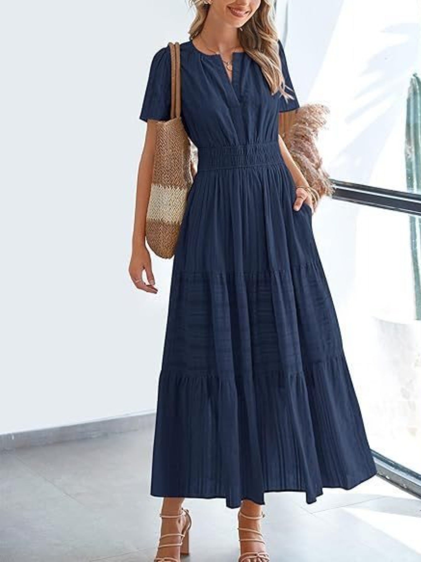 Square Neck Cap Sleeve Midi Dress